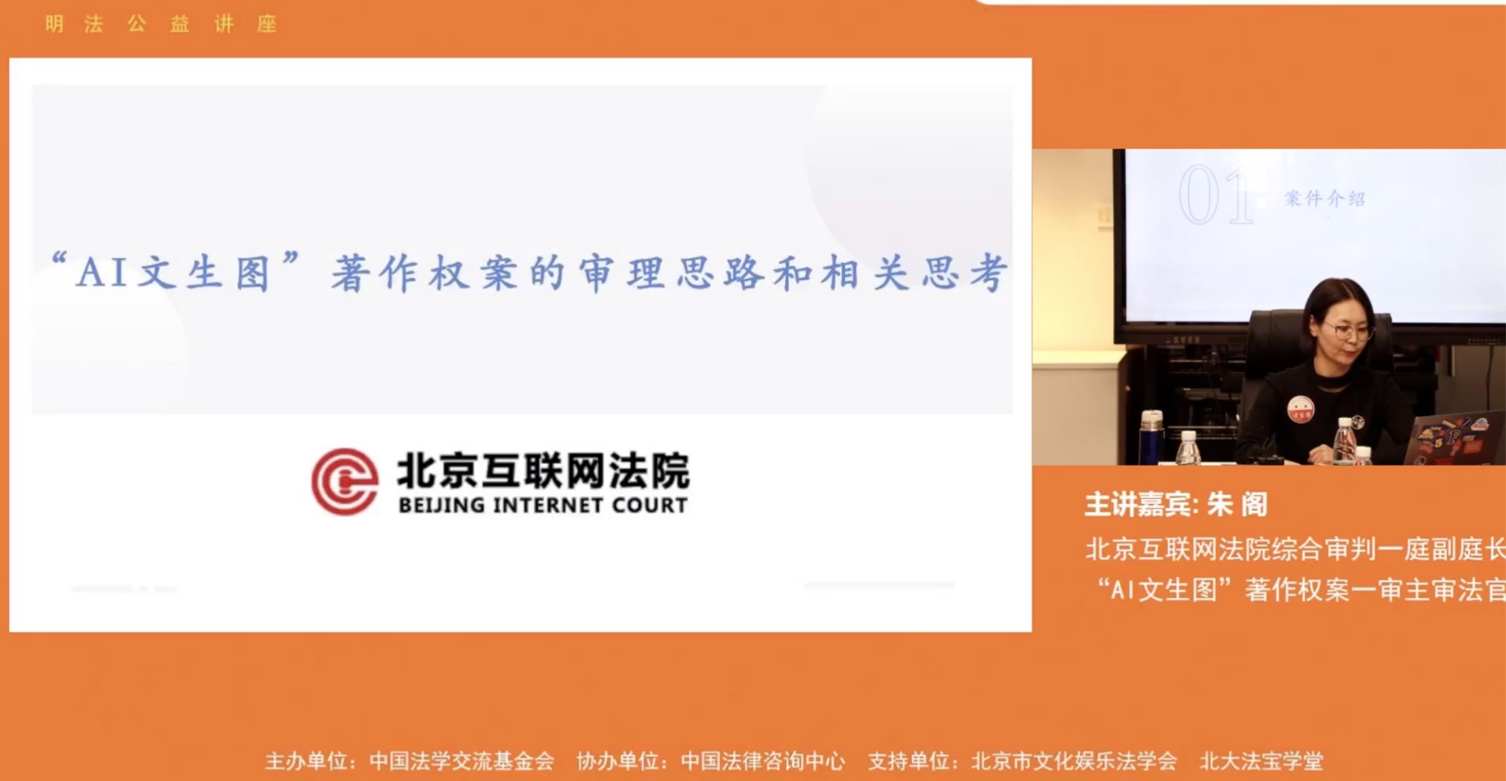 首例AI生成图侵权案一审主审法官朱阁做客中国法学交流基金会举办的公益讲座 图片来源:微信公众号“法宝学堂”直播截图