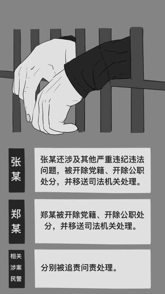 经调查核实,张某还涉及其他严重违纪违法问题,被开除党籍、开除公职处分,并移送司法机关处理;郑某被开除党籍、开除公职处分,并移送司法机关处理;相关涉案民警分别被追责问责处理。