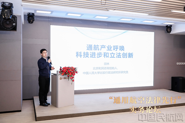 北京和民咨询有限公司创始人、中国人民大学比较行政法研究所研究员田林的发言题目为“通航产业呼唤科技进步与立法创新”,梳理通航产业的法律政策现状,并分析通用航空的立法创新需求。