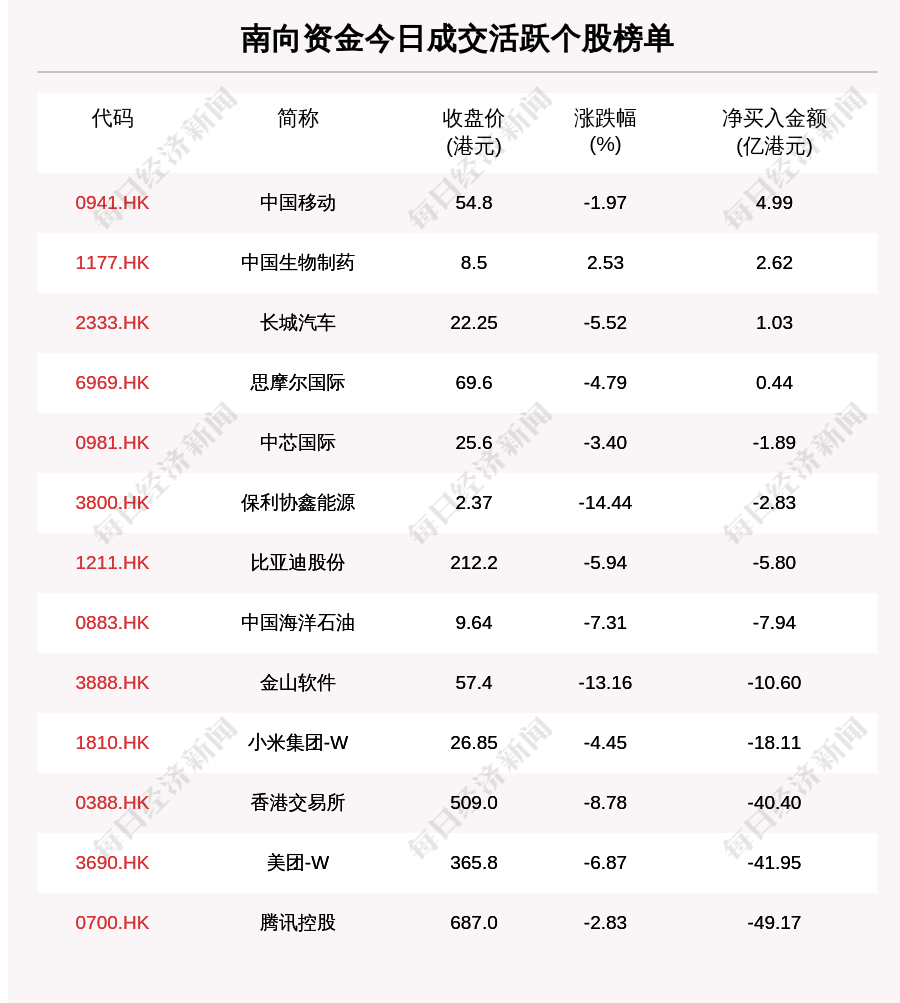 每经AI快讯,2月24日,恒生指数下跌2.99%。南向资金今日净卖出199.60亿港元。2月24日,南向资金成交活跃个股榜单中,净买入个股共4只,金额最多的是中国移动(0941.HK,收盘价:54.8港元),净买入4.992亿港元;净卖出个股共9只,金额最多的是腾讯控股(0700.HK,收盘价:687.0港元),净卖出49.172亿港元。