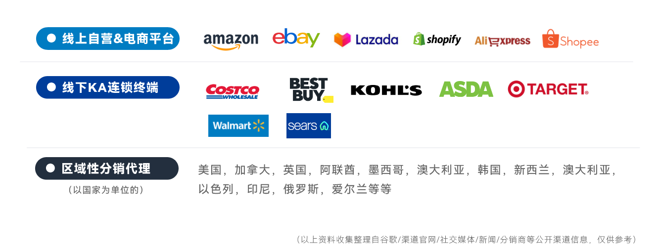 触达路径上除了最开始亚马逊平台外,也开拓了品牌独立站, bestbuy, walmart 等线下商超,甚至在迪拜等地都开设了线下专卖店。