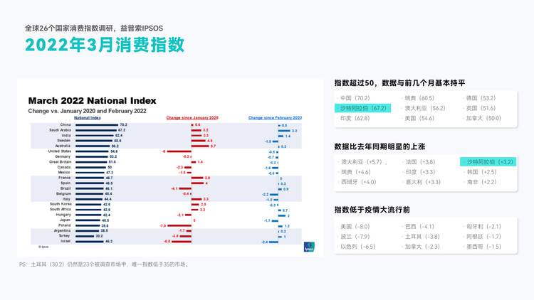 益普索2022年3月全球消费者信心指数调研显示,在世界卫生组织宣布全球疫情大流行后,虽有部分市场指数低于预期,但仍有9个市场指数呈显著增长,其中沙特阿拉伯等中东地区尤为突出。