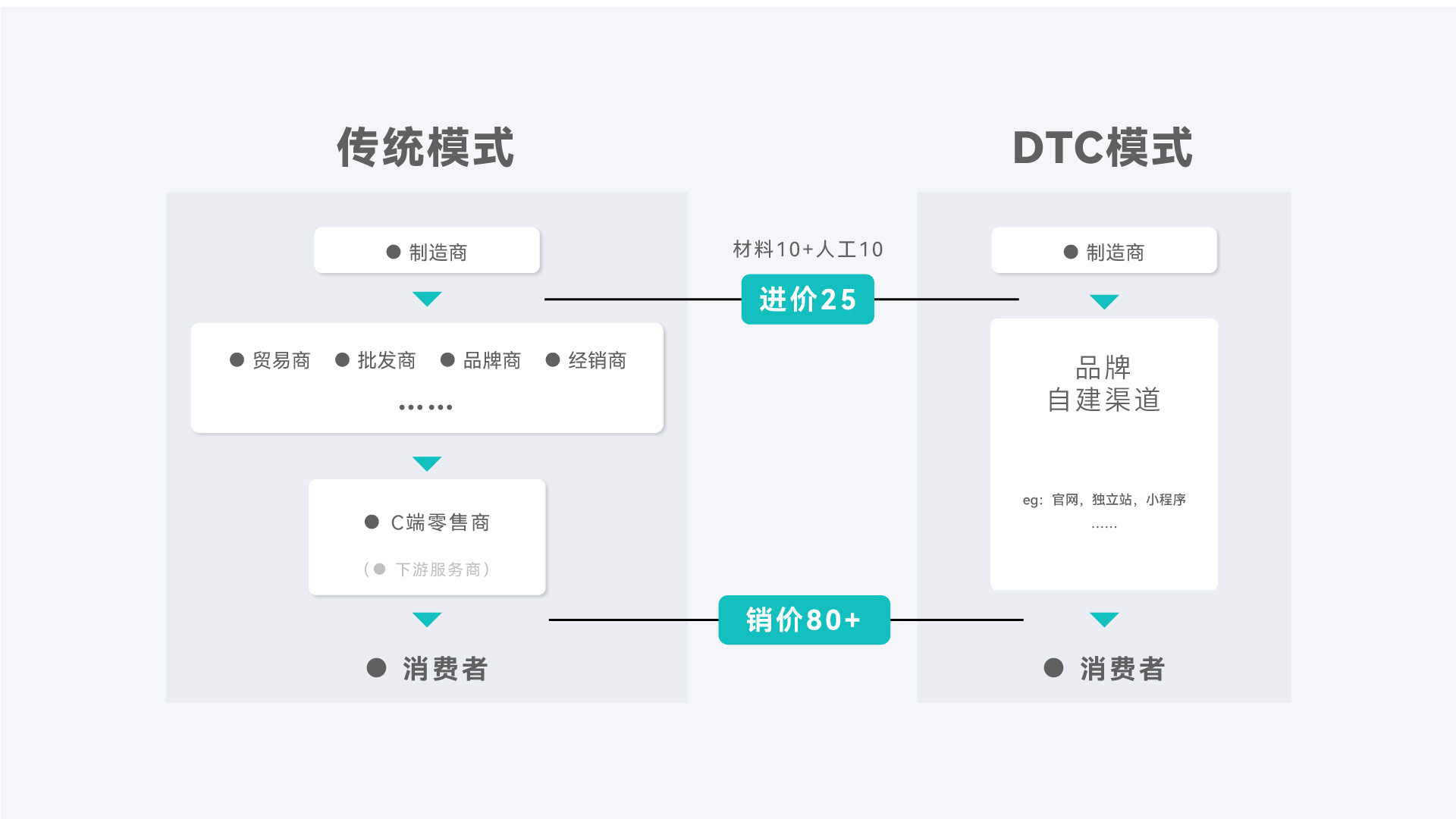 DTC模式的优势点主要落在成本,渠道,数据库&时间四个方面,主要表现为: