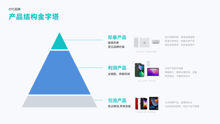 回归传统企业,产品在品牌架构中的定位决定了其未来销售方向。建议早期可以产品结构金字塔的方式,去整体拆解品牌前期产品布局。