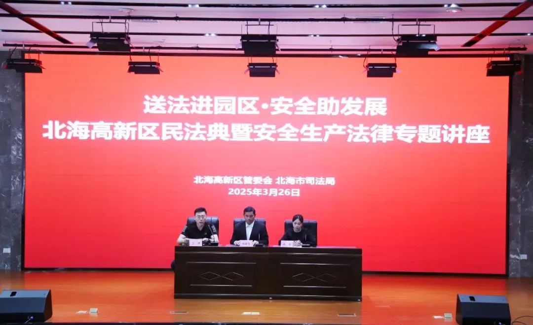 为进一步增强园区干部职工及企业法律意识,提升安全生产管理水平,助力园区高质量发展,2025年3月26日上午,北海高新区管委会联合北海市司法局举办“送法进园区·安全助发展”北海高新区民法典暨安全生产法律专题讲座。管委会各部门及直属企(事)业单位干部职工,园区重点领域安全生产工作负责人和安全生产管理员120余人参加讲座。