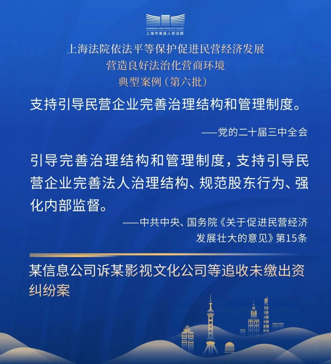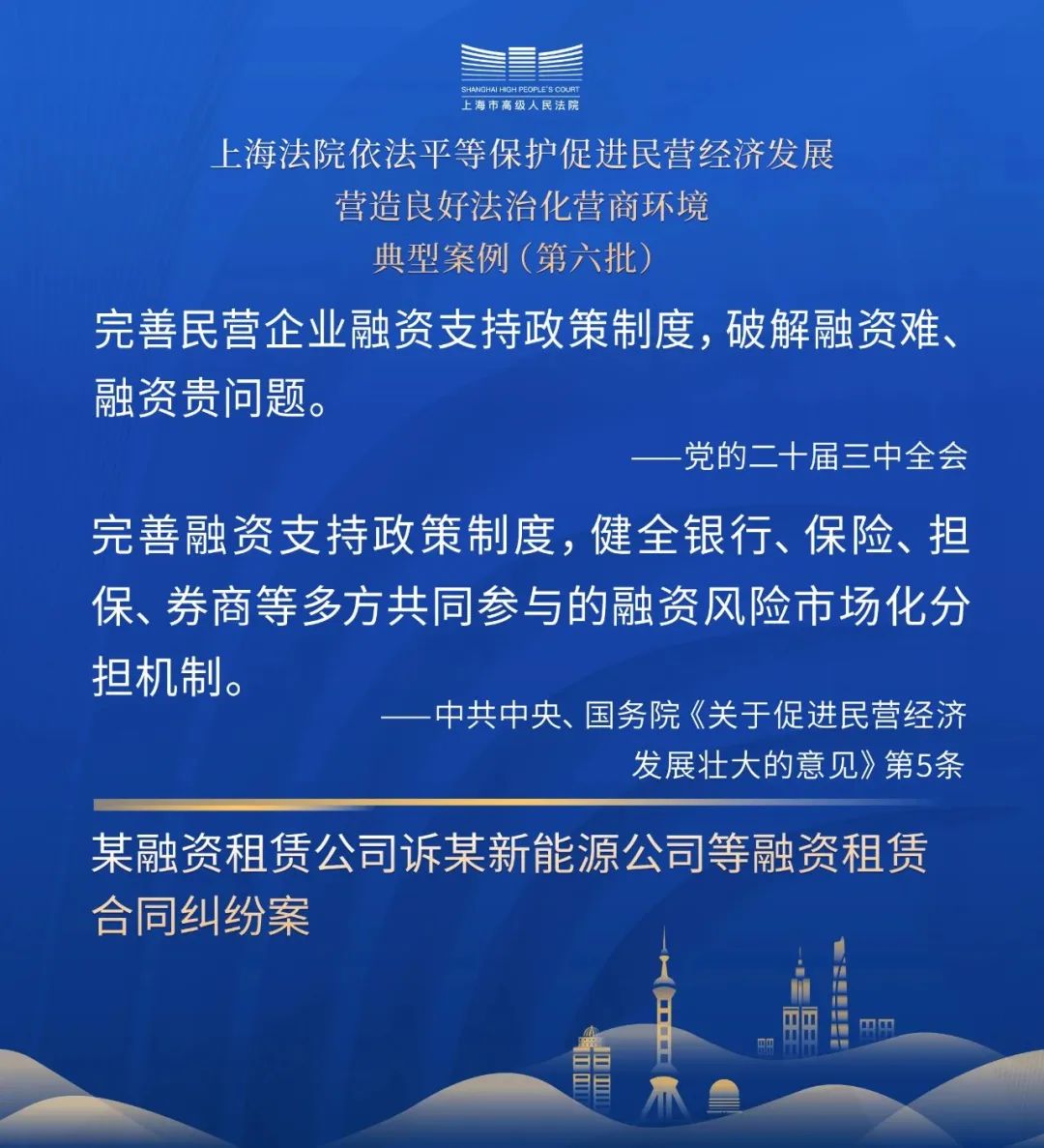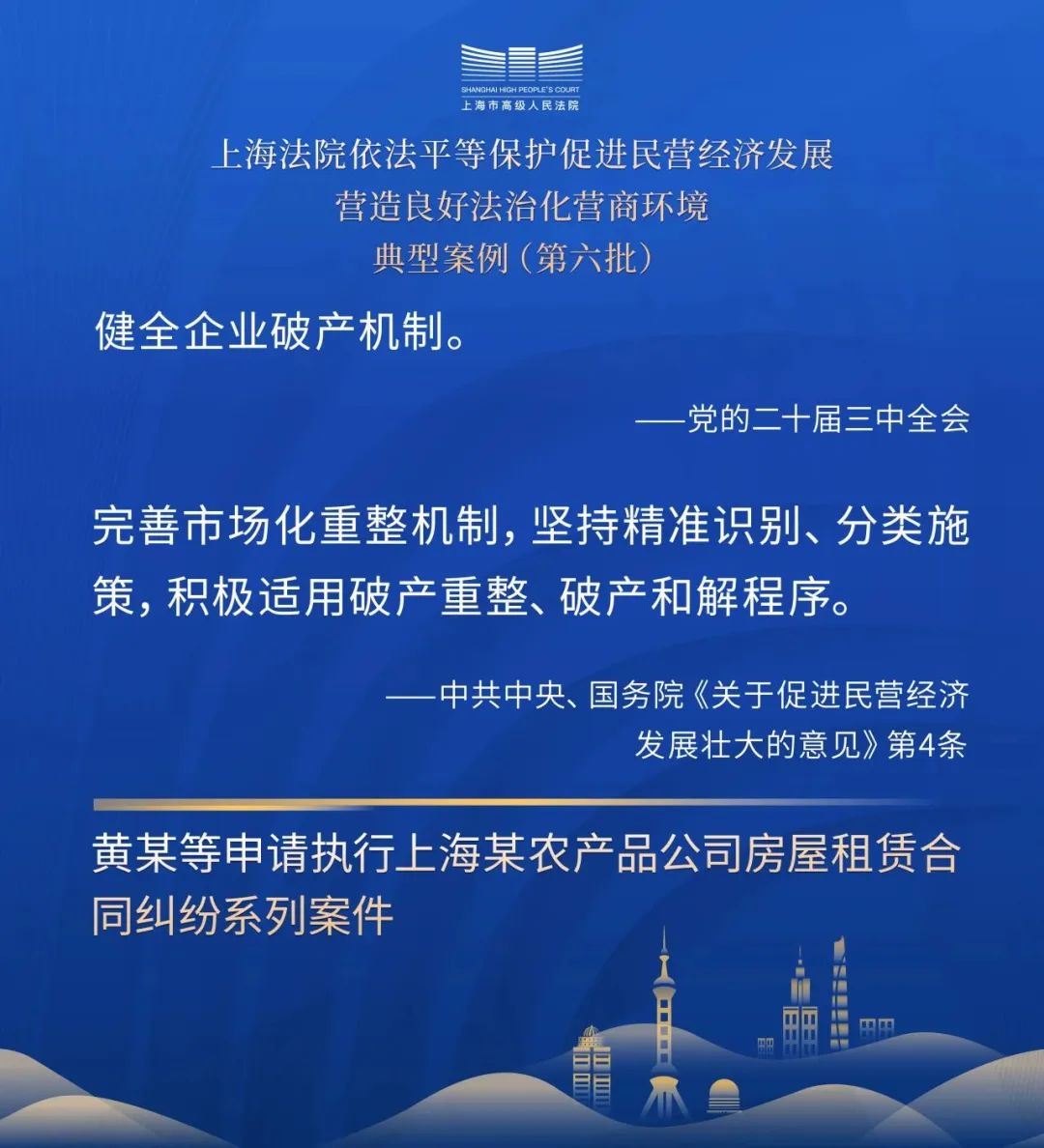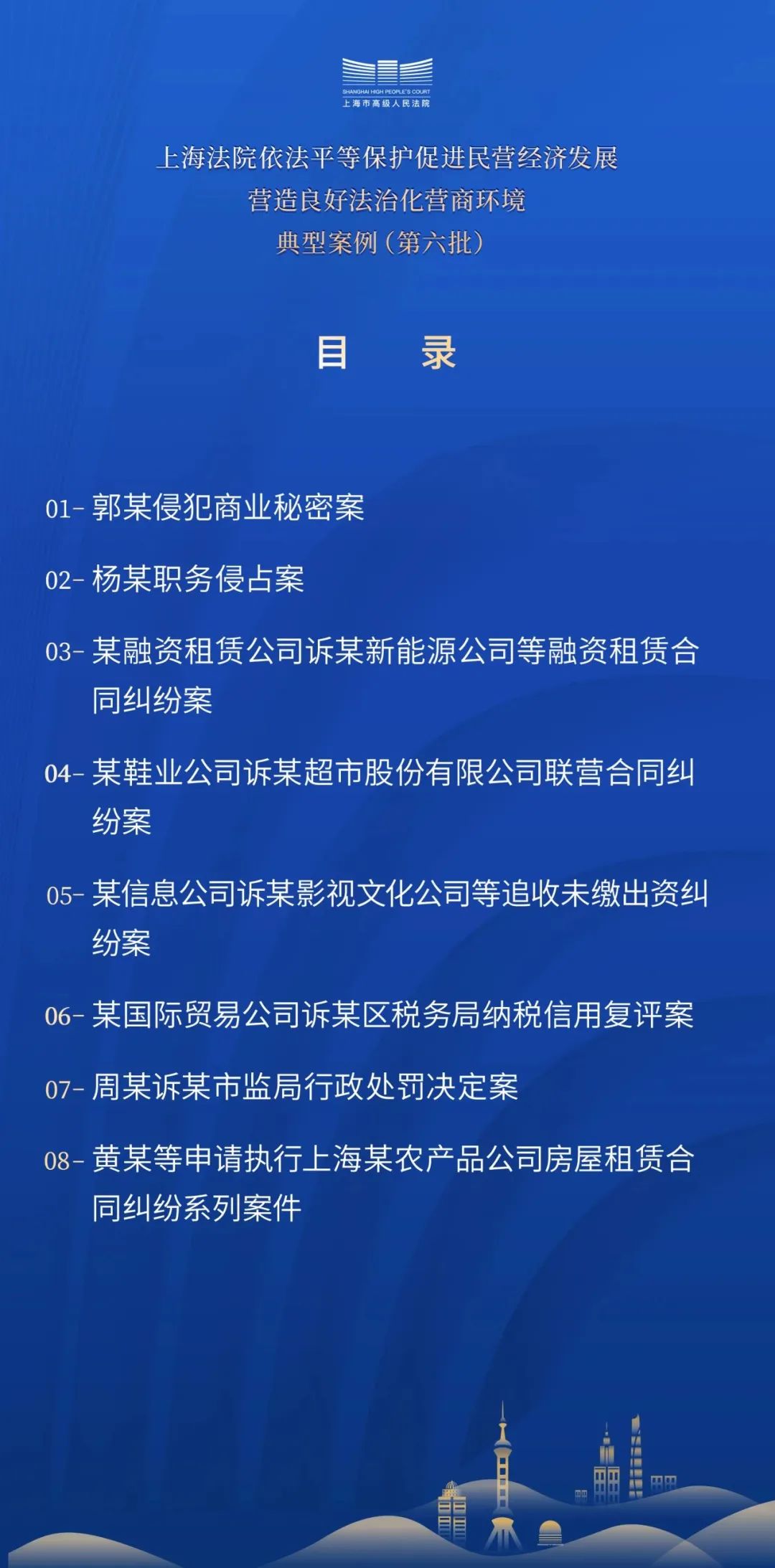 为更好地推进司法服务保障营商环境工作,根据党的二十届三中全会精神,以及中共中央、国务院《关于促进民营经济发展壮大的意见》《最高人民法院关于优化法治环境 促进民营经济发展壮大的指导意见》等文件精神,近日,上海市高级人民法院公布上海法院第六批依法平等保护促进民营经济发展的典型案例,为全市法院审判执行工作提供更多的参考和指引。