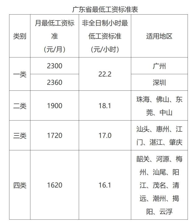 其中,深圳最低月工资标准为2360元,小时最低工资标准为22.2元。