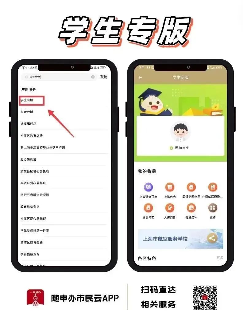 凡本市在籍学生或学生家长,皆可通过“随申办市民云”APP“学生专版”服务,了解学校动态、招生考试、查询学籍档案、学区查询等