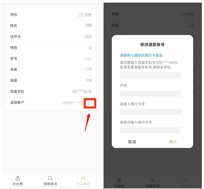 ①点击“个人中心”,核对学生基本信息后,点击退款账户的编辑按钮,填写在学校预留的家长手机号码信息;