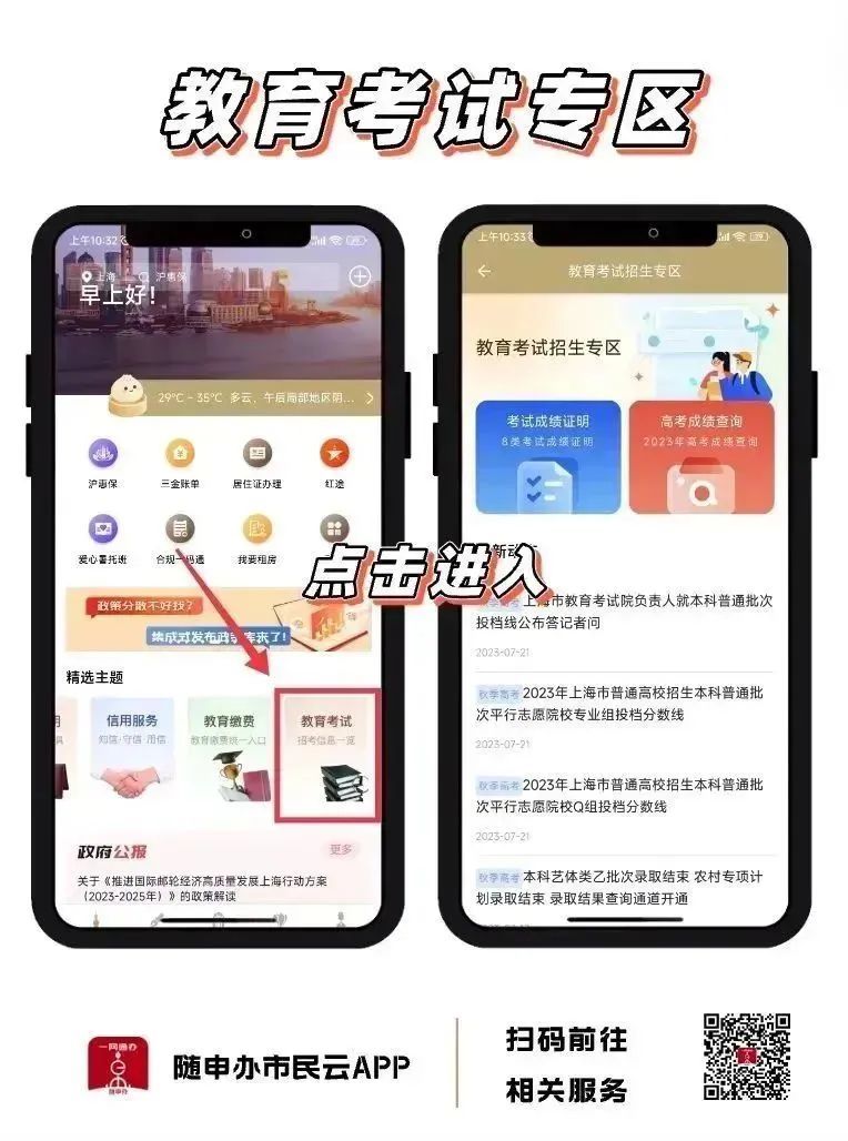 “随申办市民云”APP【教育考试】专区,提供“成人高考”等八大类型考试成绩证明办理