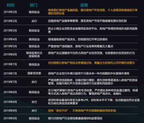 2019年在市场流动性整体放松的环境下,房地产金融侧却愈加收紧,向市场传递出明显信号。即房住不炒已从行业源头入手,不但要控制房地产开发企业风险,同时通过金融侧调控,有力提升房地产去产能的节奏。