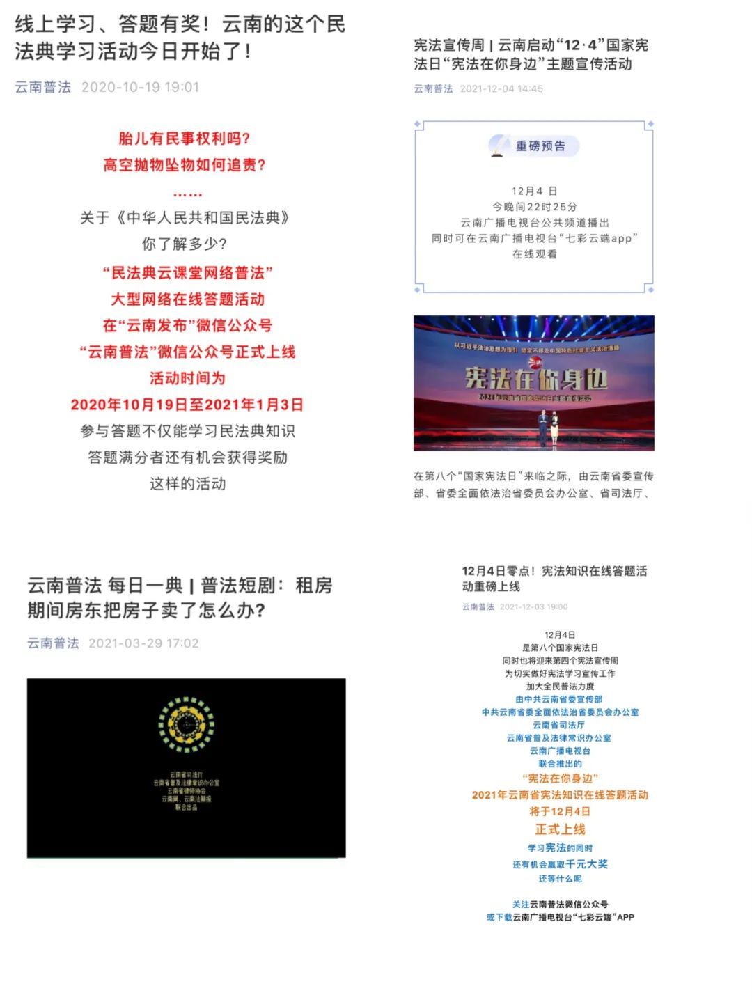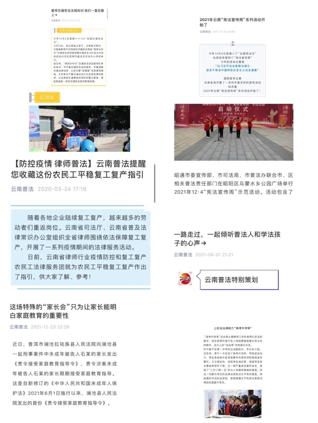 以“云南普法”微信公众号为支点,微信公众号经常性汇总推送各行、各业、各部门、各地区普法宣传活动,在全社会营造“人人争当法律明白人”的良好氛围。从后台数据来看,目前,“云南普法”微信公众号已成为备受全国网友欢迎的学法、找法线上平台。
