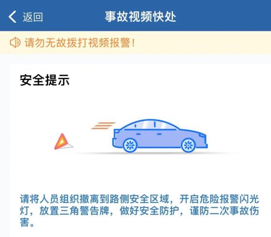 使用“事故视频快处”前务必先开启车辆双闪灯,在肇事车后50至100米处摆放三角警示牌,做好现场安全警示,确保安全。“视频快处”完成后立刻撤离现场,避免二次事故发生!事故视频快处功能虽然方便、快捷、高效,但也希望每一位交通参与者都能够严格遵守道路交通法律法规,切勿乱拨视频报警,占用报警资源。