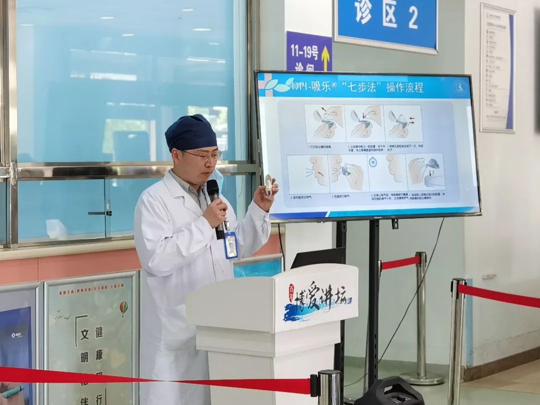 5月10日,药学部呼吸临床药师胡振夏在金山院区门诊大厅作了题为《常用吸入药物的吸入方法》的科普讲座,介绍了药物吸入治疗的概念,演示了干粉吸入剂、压力定量气雾剂、软雾吸入剂等常用的吸入装置的用法,并解释了使用过程中的注意事项。讲座吸引了大量的门诊患者驻足聆听,胡药师还就患者的提问进行了现场答疑。