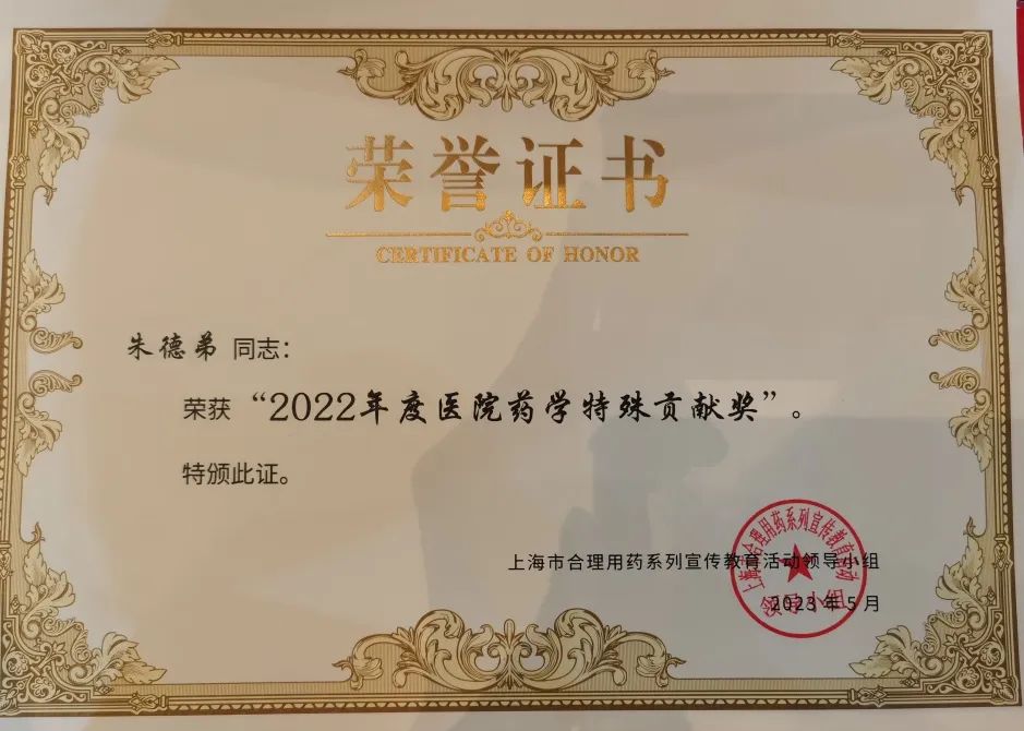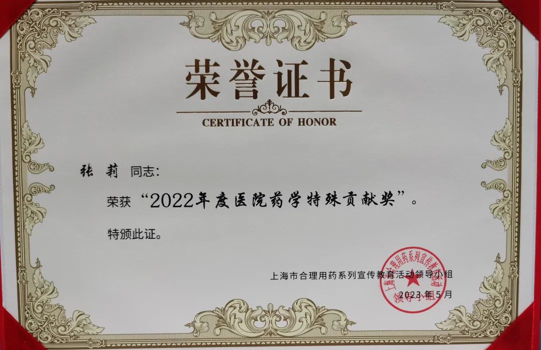 由上海市卫生健康委员会、上海市医疗保障局、上海市药品监督管理局指导,上海市医学会、上海市药学会、上海市医院协会、上海市医师协会主办,中国医药工业信息中心、上海市临床药事管理质控中心、上海市卫生和健康发展研究中心、上海市医药卫生发展基金会、上海市社区卫生协会承办的“第七届上海合理用药高峰论坛”于2023年5月19日在上海市长宁区召开,上海市合理用药系列宣传教育活动领导小组为“2022 年度医院药学特殊贡献奖”获得者进行了表彰,药学部的张莉和朱德弟两位药师获得了此项荣誉。