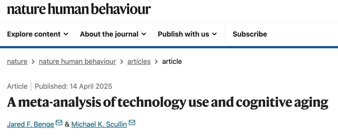这项研究为如今日益严峻的老龄化社会指明方向:在数字时代,善用科技将成为对抗认知衰退的新防线——生物学不再决定命运,科技可以改写衰老剧本。德克萨斯大学奥斯汀分校和贝勒大学的研究人员在 Nature 子刊 Nature Human Behaviour 上发表了题为:A meta-analysis of technology use and cognitive aging 的研究论文。
