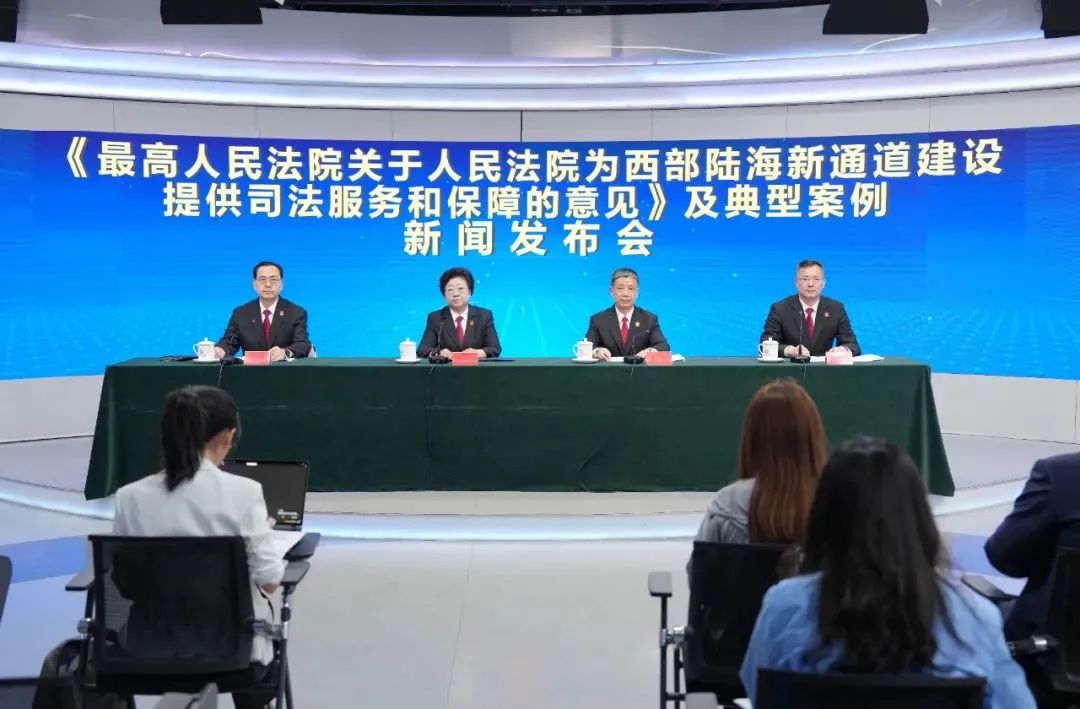 2025年4月28日下午,最高人民法院发布《最高人民法院关于人民法院为西部陆海新通道建设提供司法服务和保障的意见》、人民法院服务西部陆海新通道建设典型案例,并回答记者提问。最高人民法院审判委员会副部级专职委员王淑梅、重庆市高级人民法院院长李永利及最高人民法院民四庭副庭长王海峰出席发布会。发布会由最高人民法院新闻局副局长姬忠彪主持。发布会上,最高人民法院民四庭副庭长王海峰发布了人民法院服务和保障西部陆海新通道建设典型案例。