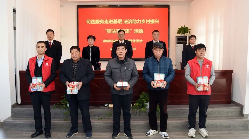 出席领导为现场村民赠送崇明法院编写的环资审判、诉讼指南和乡村案例法官说等普法书籍。民庭法官助理邱扬、堡镇法庭法官助理周志鹏和刑庭法官助理柴敏杰,分别围绕《民法典》婚姻家庭编新规定、农村宅基地房屋典型问题、电信网络诈骗犯罪常见问题及其防范等主题,结合典型案例为现场村民作法治讲座。青年法官周学培及法官助理们还现场开展法律咨询,解答了村民提出的相关问题。