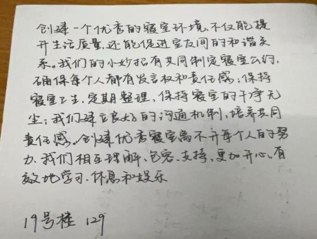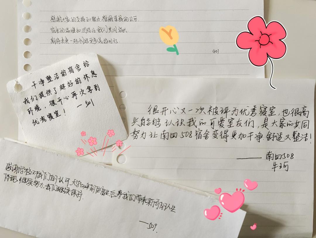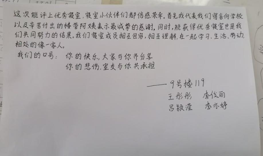 “非常开心能够被评选为优秀寝室!大一一年里我们寝室四人共同营造着这一温馨小窝,相互支持,默契合作,慢慢的我们获得了深厚的友谊。我们深知将在302这个温暖的寝室度过我们快乐的四年大学生活,很庆幸能与如亲人般关心我们的宿管阿姨们一起生活!未来三年,我们将共同维护这个充满爱的小空间,我们会更加珍惜这份荣誉,让它成为我们大学生活中美好的回忆!”
