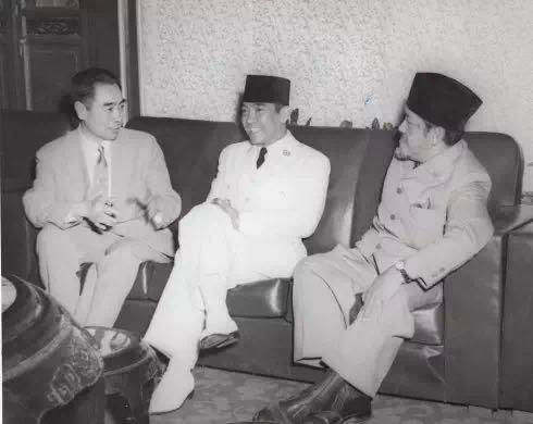 万隆会议结束后,周恩来应邀访问印尼。这是他在招待会上同印尼总统苏加诺(右二)、总理沙斯特罗阿米佐约(右一)交谈