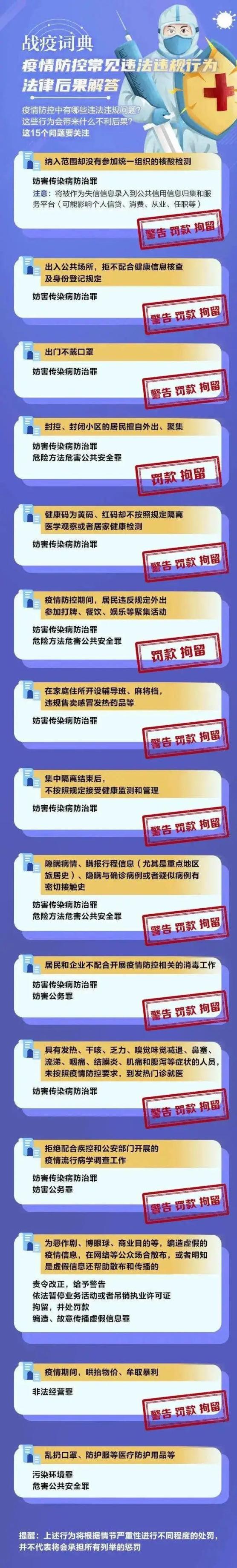 为帮助广大市民理解疫情防控中常见的违法违规问题,认清违法违规行为带来的不利法律后果,推动疫情防控工作依法依规高效进行,这 15 个方面的问题,请关注!↓↓↓