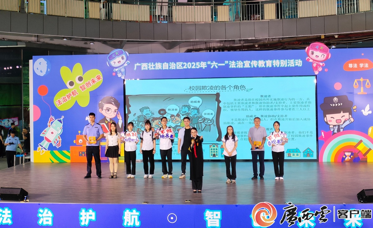 在5月25日的广西法治宣传活动中,情景剧表演聚焦校园欺凌主题,向家长和孩子传递防治欺凌的法治知识与文明理念。广西云-广西日报记者 刘莉 摄