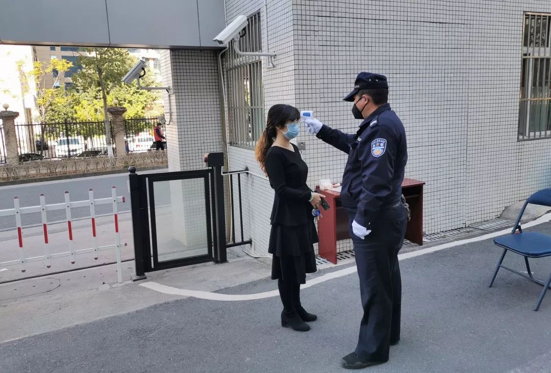 安保人员为干警进行体温检测