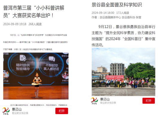 积极普及科学知识,为提高公众的科学文化素质提供舆论支持。2024年,普洱市融媒体中心抓住重要节点、重要事件,全面反映全市科技创新成果,开展科普宣传。在全国科普日、科技活动周等期间,集中展示科技创新成果。发布《科普宣传进校园 气象知识“零”距离》《镇沅县:科普大篷车点亮少年科技梦》等稿件90余条次。广播直播栏目《快乐早点到》《为人民服务》开设“清晨深呼吸”“健康科普”等专栏,播出《这种保温杯会让热水变“毒水”,你可能正在用!》《黑咖啡真的能减肥吗?》等科普宣传298条,播出科普节目《带状疱疹的疼痛治疗》等64期;《金色年华》开设“普洱市第三届‘小小科普讲解员’大赛”专栏,播出《蛇形摆的秘密》等28条。
