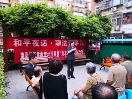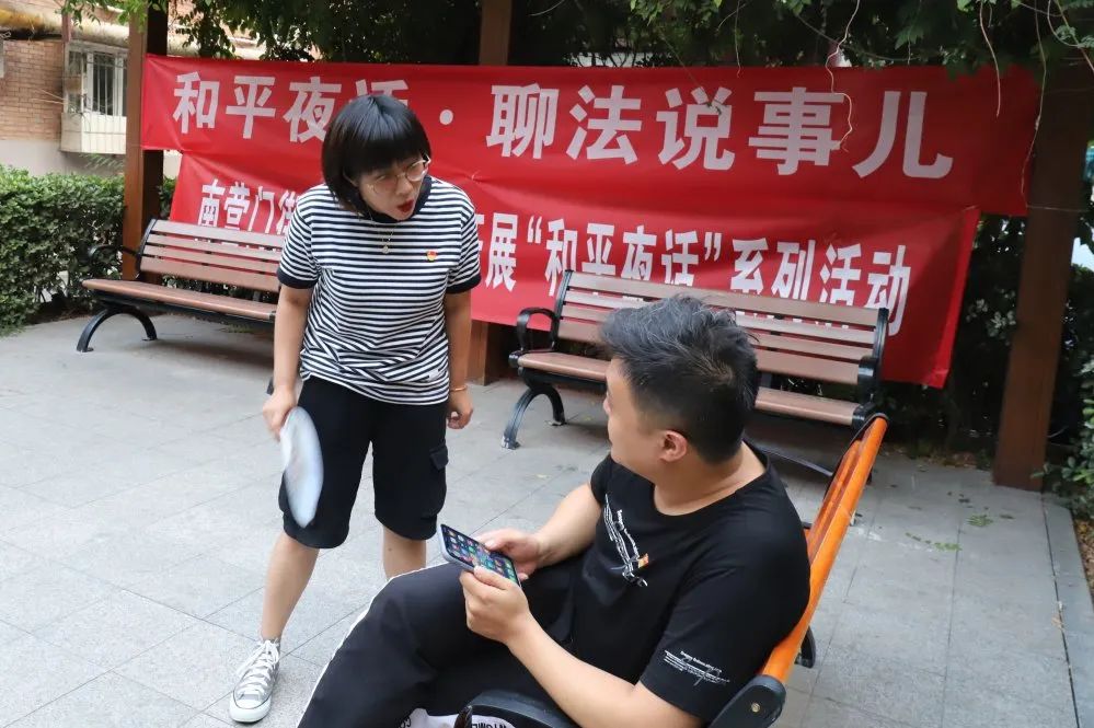 “这不和平法院法官来咱们小区‘和平夜话·聊法说事儿’,好好听听吧,给你这法盲普普法!”