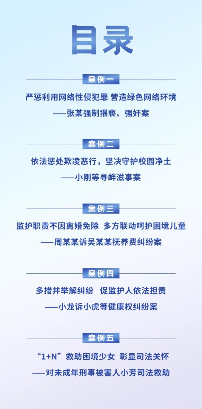 每年六一,我们都会发布一批保护未成年人权益典型案例。本次发布的5件典型案例,有法院重拳严惩性侵、猥亵未成年人等侵害行为;有依法惩处欺凌恶行,坚决守护校园净土;有对事实无人抚养儿童、困境儿童等特殊群体的多举措帮扶救助;有多措并举解纠纷、督促未成年人父母依法承担监护职责;还有跨部门协作关爱、救助陷入困境的未成年刑事被害人。