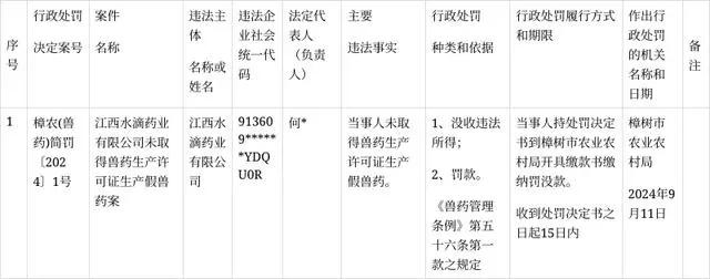 江西樟树市农业农村局18日发布行政处罚信息,内容显示,江西水滴药业有限公司未取得兽药生产许可证生产假兽药近期受到罚款并没收违法所得的行政处罚。
