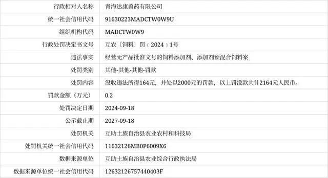 金融界消息,近日,青海达康兽药有限公司被互助土族自治县农业农村和科技局罚款。