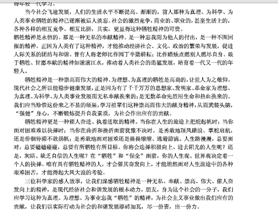 当今社会飞速发展,人们的生活水平不断提高。渐渐的,前人那种为真理、为科学、为人类事业牺牲的精神已逐渐被后人淡忘。社会的激烈竞争,商业的、职业的,甚至生活上的,各种各样的相互竞争、相互比拼,其实,更显得这种牺牲精神的可贵。
