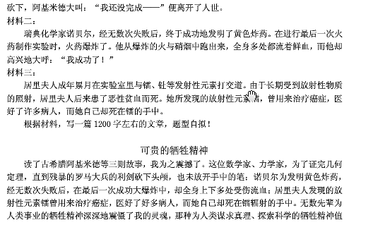 材料三:居里夫人成年累月在实验室里与镭、钍等发射性元素打交道。由于长期受到放射性物质的照射,居里夫人后来患了恶性贫血而死。她所发现的放射性元素镭,曾用来治疗癌症,医好了许多病人,而她自己却死在镭的手中。根据材料,写一篇1200字左右的文章,题型自拟! 可贵的牺牲精神