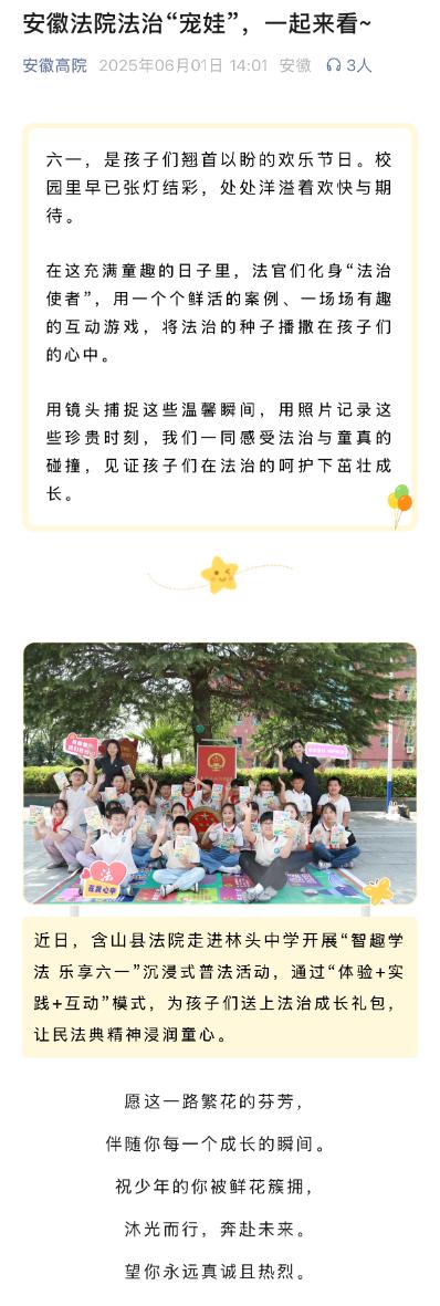 6月1日,安徽高院微信公众账号以安徽法院法治“宠娃”,一起来看~为主题,报道了含山法院普法宣传工作相关情况。