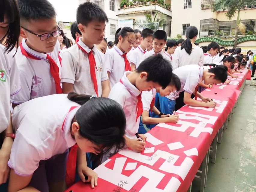 武江区田家炳小学学生在防溺水“六不”承诺现场签名。田家炳小学提供