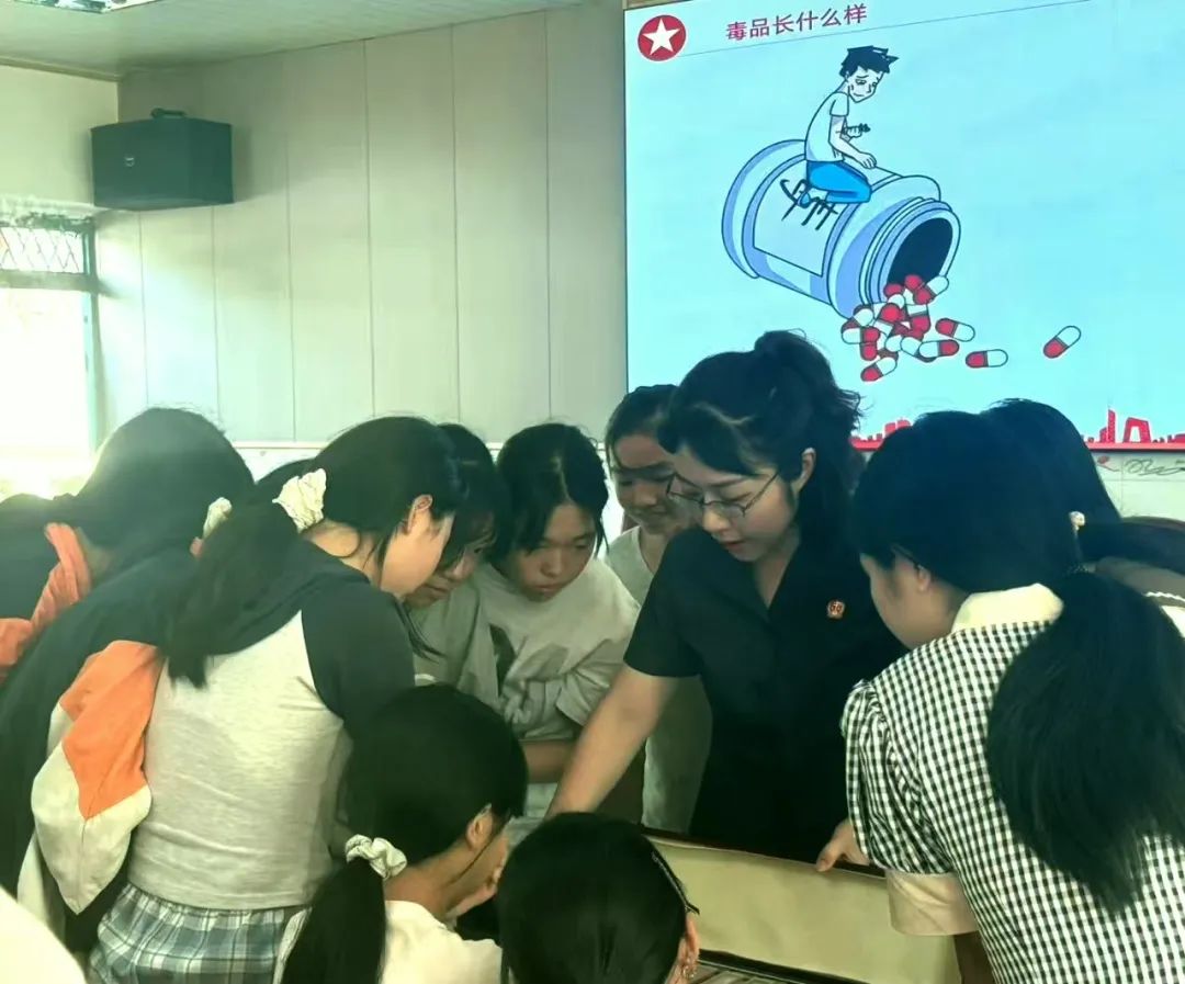 授课中,宣讲干警结合毒品犯罪典型案例,通过视频、PPT展示讲解毒品的概念、种类,以及吸毒对身体、家庭和社会的严重危害,让同学们了解禁毒知识和涉毒犯罪的法律后果。宣讲干警还结合真实案例,生动讲解了反校园欺凌、防性侵等与青少年学习生活密切相关的法律知识,引导同学们明辨是非,学会用法律武器维护自身合法权益,增强自我保护意识和防范能力,自觉远离违法犯罪。“向未成年人出售毒品会受到什么处罚?”“我国第一部全面规范禁毒工作的法律是什么?”“国际禁毒日是每年的哪一天?”……活动现场穿插“禁毒知识快问快答”,同学们争相举手,答对的同学还收获了“小礼品”。