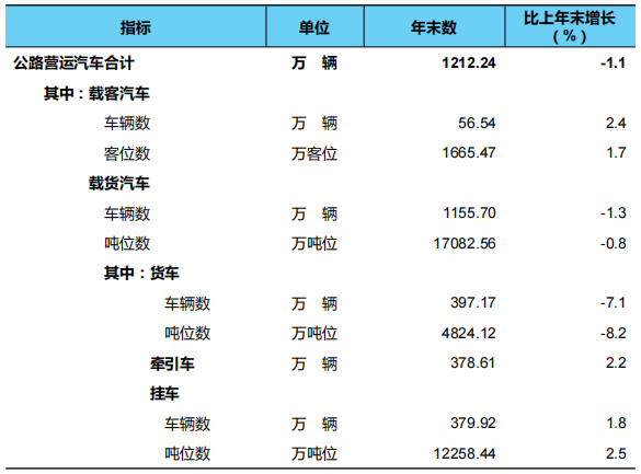 年末全国拥有公路营运汽车1212.24万辆。分结构看,拥有载客汽车56.54万辆、1665.47万客位,比上年末分别增加1.30万辆、27.18万客位;拥有载货汽车1155.70万辆、17082.56万吨位,分别减少15.27万辆、134.15万吨位,其中,普通货车325.15万辆、4037.73万吨位,分别减少33.55万辆、396.78万吨位,专用货车72.02万辆、786.39万吨位,分别增加3.33万辆、减少31.35万吨位,牵引车378.61万辆、增加8.23万辆,挂车379.92万辆、增加6.72万辆。