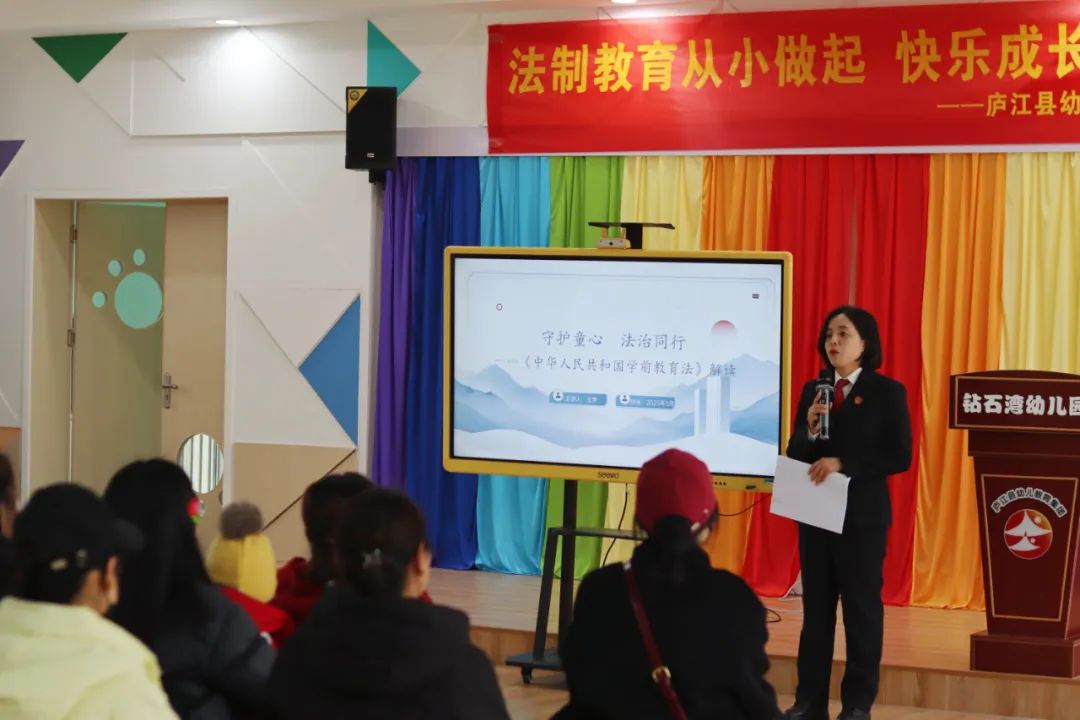 近日,庐江法院立案庭法官助理王芳走进钻石湾幼儿园,开展新学期普法宣传活动。此次宣传以“守护童心 法治同行”为主题,带领幼儿园孩子们的家长学习了将于2025年6月1日开始实施的《中华人民共和国学前教育法》。