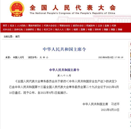 2021年6月10日,中华人民共和国第十三届全国人民代表大会常务委员会第二十九次会议通过《全国人民代表大会常务委员会关于修改<中华人民共和国安全生产法>的决定》。新《安全生产法》将于2021年9月1日起施行!