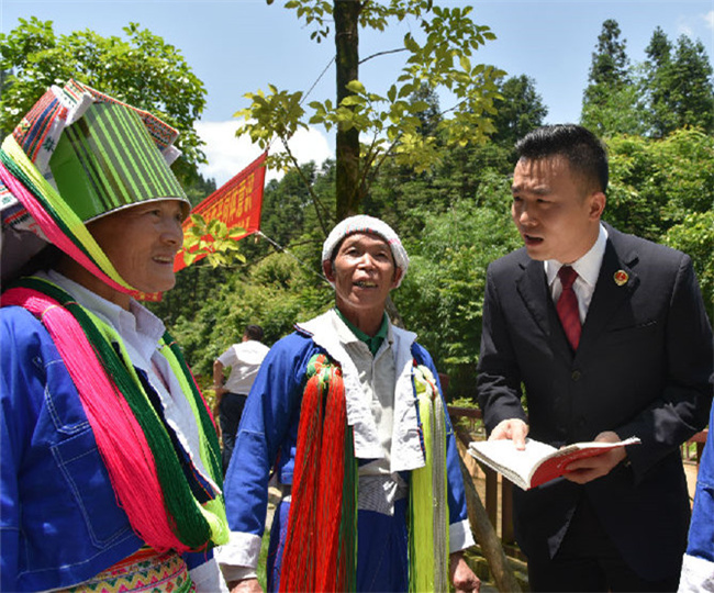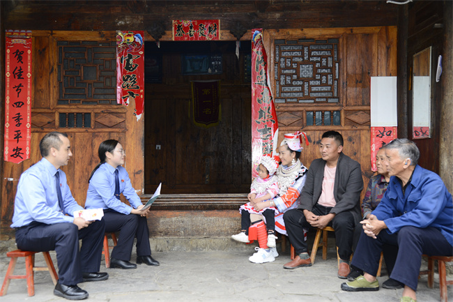 近日,贵州省黄平县检察院组织会少数民族语言的检察干警走村入户开展双语普法活动。检察干警重点围绕民法典婚姻家庭编进行宣讲,引导群众树立优良家风,弘扬家庭美德。本报记者张安 通讯员王超摄