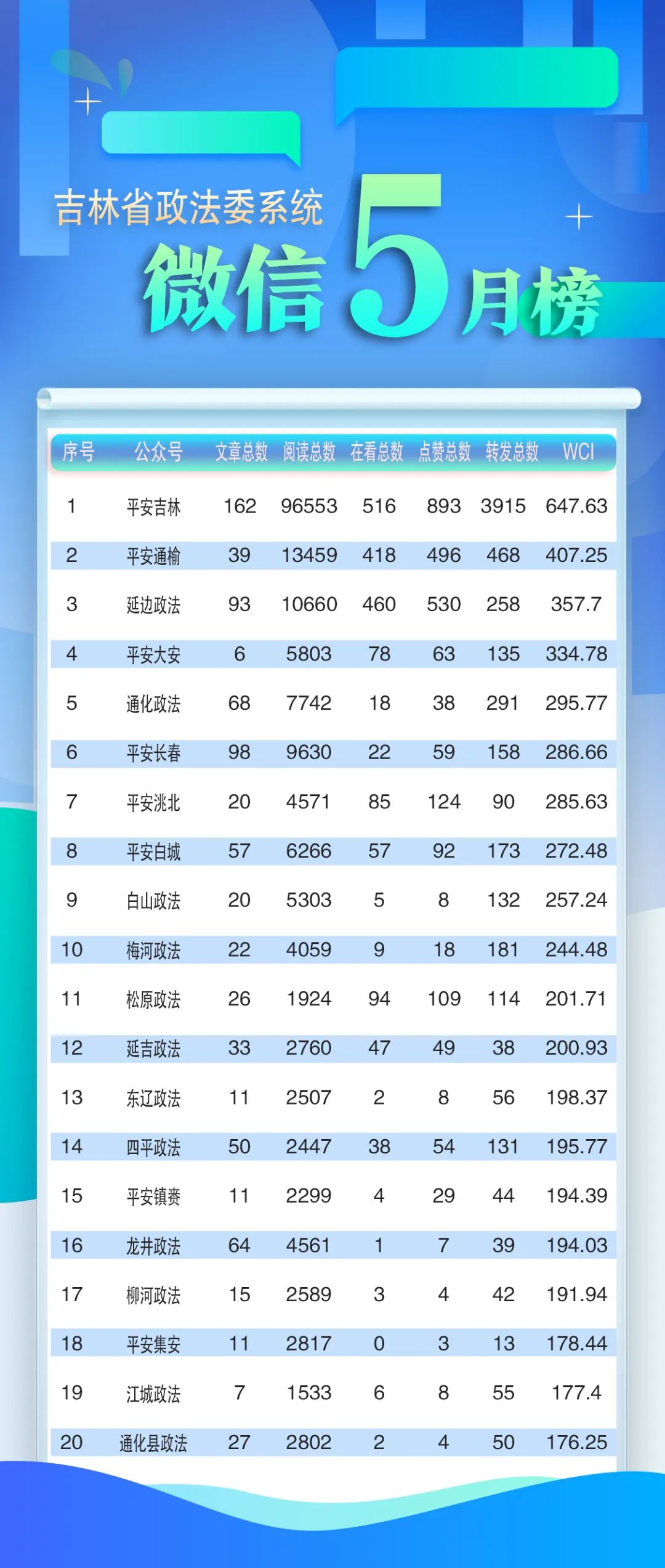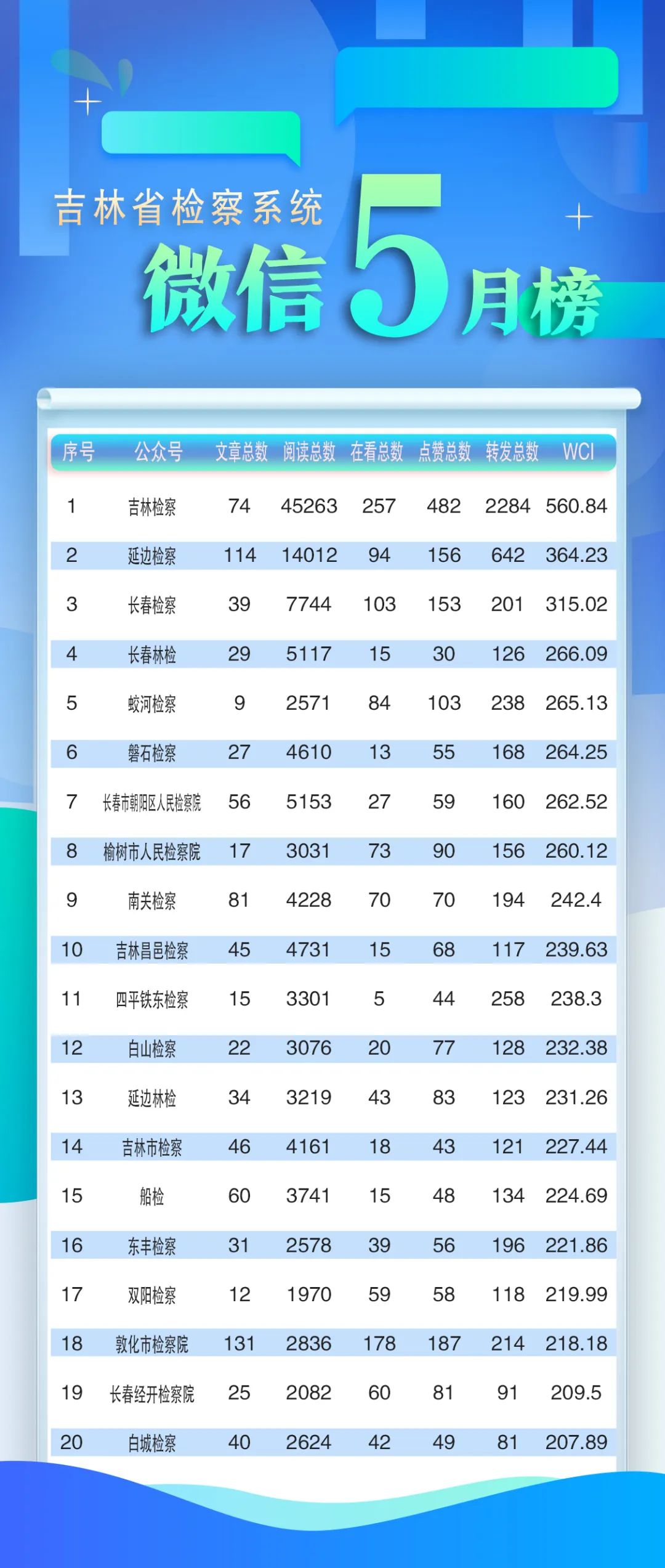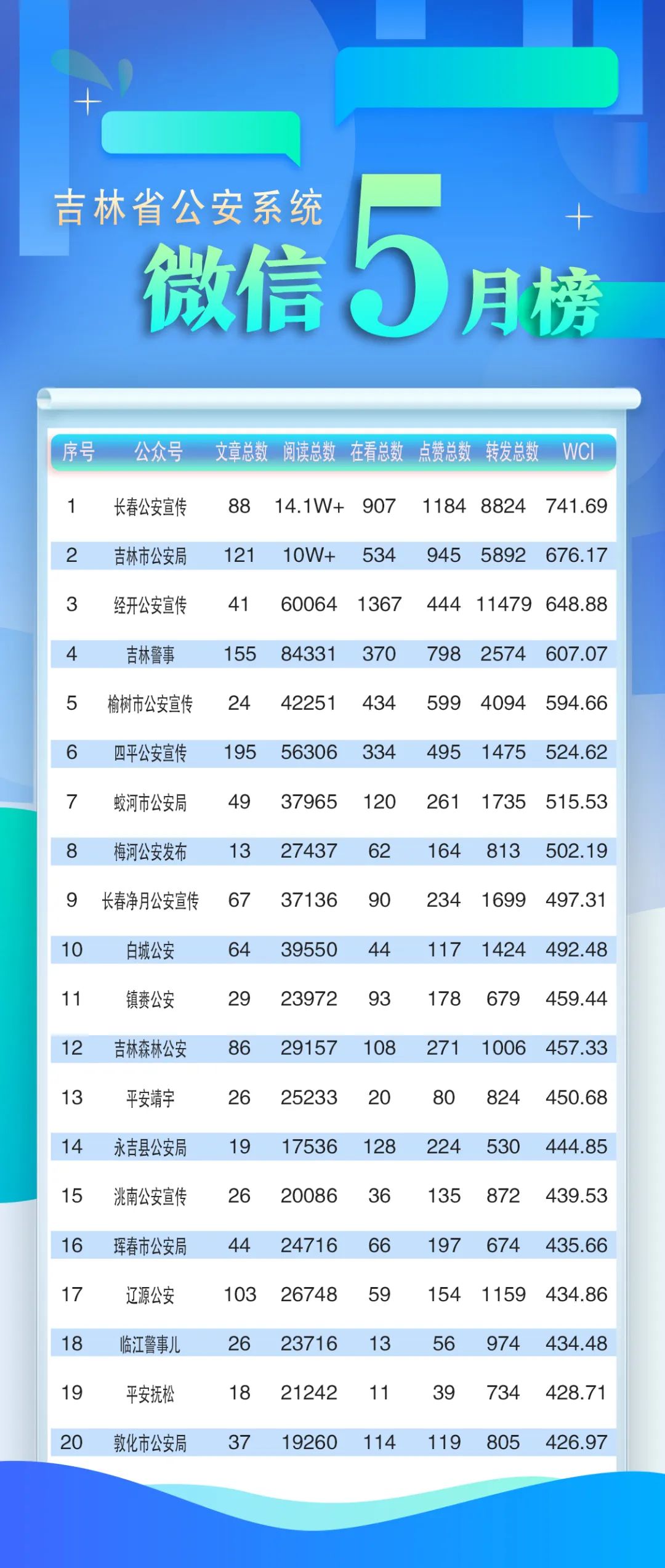 恭喜“长春公安宣传”获得5月微信公众号总榜第一名!“吉林市公安局”获得总榜第二名,“吉林省高级人民法院”获得总榜第三名。