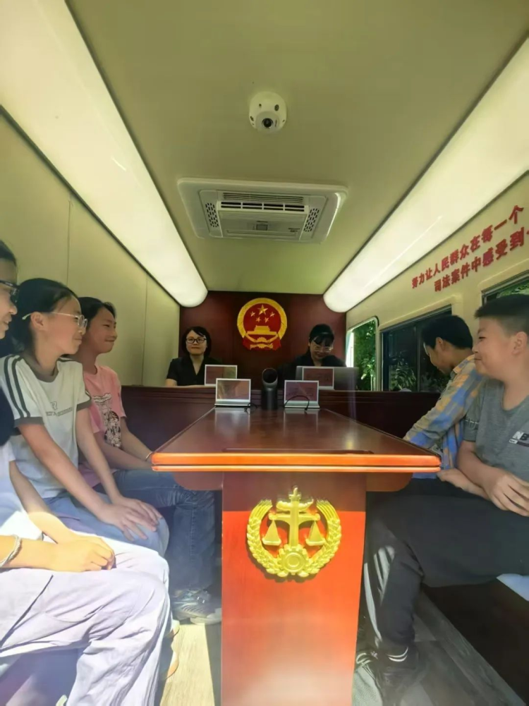 在搭载智慧法院系统的“车载便民法庭”上,孩子们体验各项智慧终端系统,通过法官的讲解深入了解《中华人民共和国未成年人保护法》。“面对不法侵害,勇敢说‘不’!每一次沉默都是纵容,每一次漠视都是帮凶!”法官铿锵有力的话语,为孩子们敲响了自我保护的警钟。