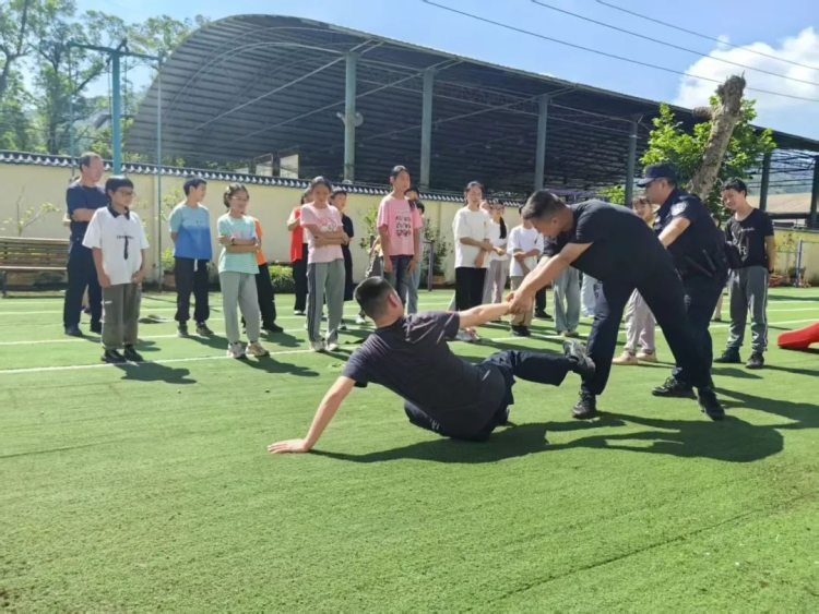 现场,由法警队带来的“防身术教学”,成为活动中的一抹亮色。“跑、喊、挡”三字诀,挣脱控制的“发力快、重心稳”,防御姿态的“手护头、身侧避”,这些实用的技能在法警们专业利落的演示和孩子们的亲身体验中变得鲜活。在欢声笑语和阵阵掌声中,孩子们不仅学习了应对突发危险的技巧,更增强了自信。