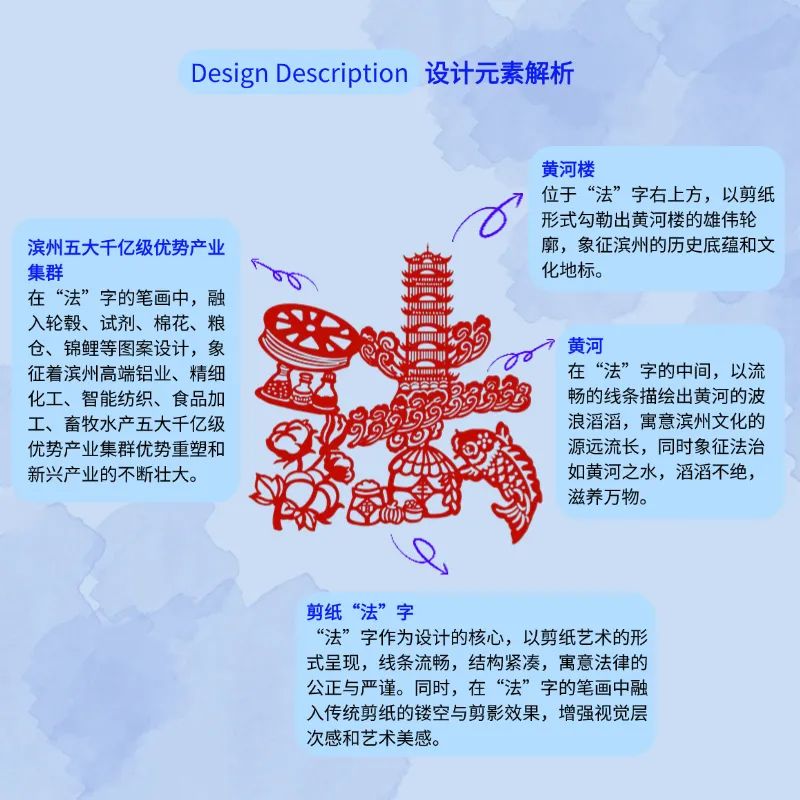 以国家级非物质文化遗产——滨州剪纸艺术为载体,巧妙地将“法”字与滨州的文化地标及五大千亿级优势产业集群相结合,旨在展现滨州深厚的文化底蕴与现代产业发展的蓬勃生机。