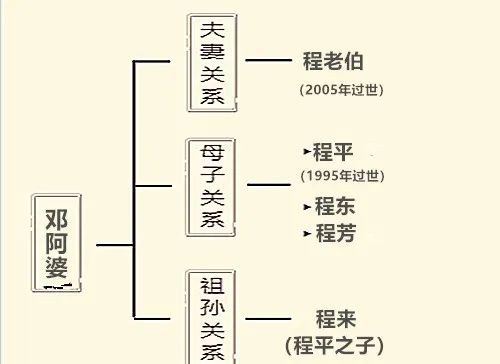 邓阿婆与程老伯为夫妻关系,程老伯已于2005年过世,二人婚内育有三名子女,分别为1995年身故的长子程平、次子程东、女儿程芳。程来为程平独子,即邓阿婆的长孙。