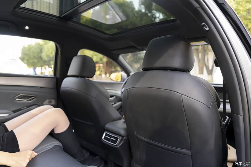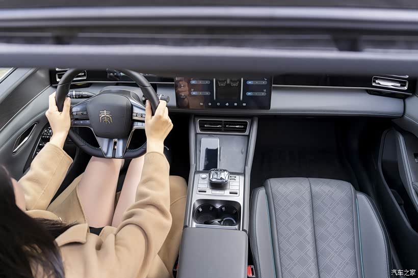 不过舒适度有保障的前提是空间要足够宽敞,北北对空间的描述是,不能说十分优秀,但用起来也绰绰有余,秦L DM-i的轴距是2790mm,前排空间更是不用多说,后排空间也能满足家用属性,纯平的地板设计,一般这是纯电车上才有的,但在秦L DM-i上看到了,可以轻松容纳三个人,最大程度的释放腿部空间。