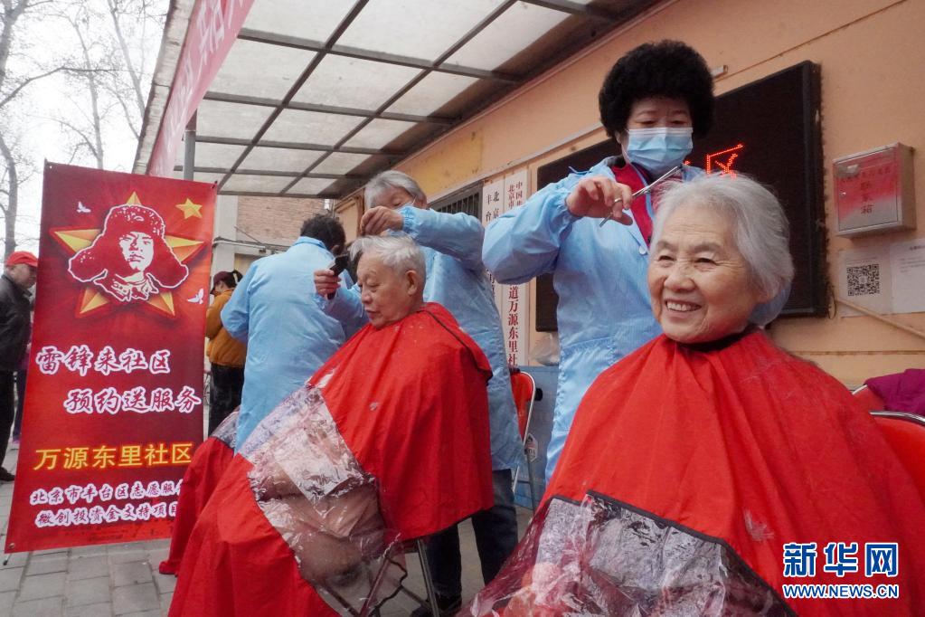 2021年3月5日,北京市丰台区东高地街道的志愿者为社区内的老人理发。新华社记者 李欣 摄