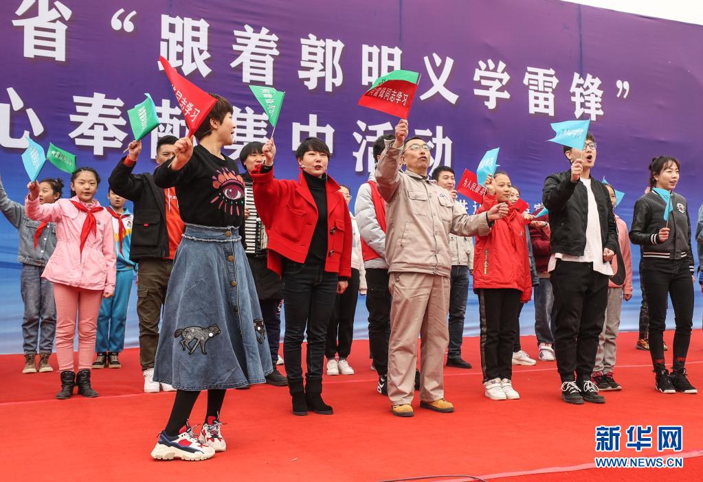 2019年3月5日,在辽宁省葫芦岛市文化广场举行的辽宁省“跟着郭明义学雷锋”爱心奉献集中活动现场,郭明义(前排中)与志愿者合唱《学习雷锋好榜样》歌曲。新华社记者 潘昱龙 摄