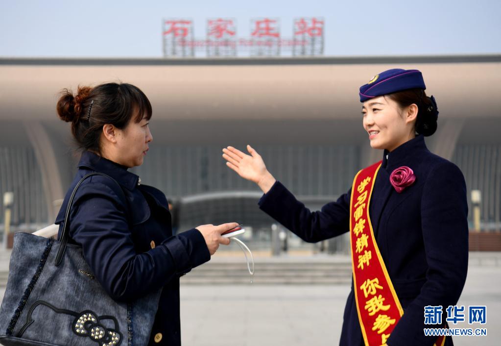 2019年3月5日,在石家庄站广场,中国铁路北京局集团有限公司京铁列服公司石家庄分公司高铁餐吧部的工作人员引导一名旅客前往候车位置。新华社记者 王晓 摄